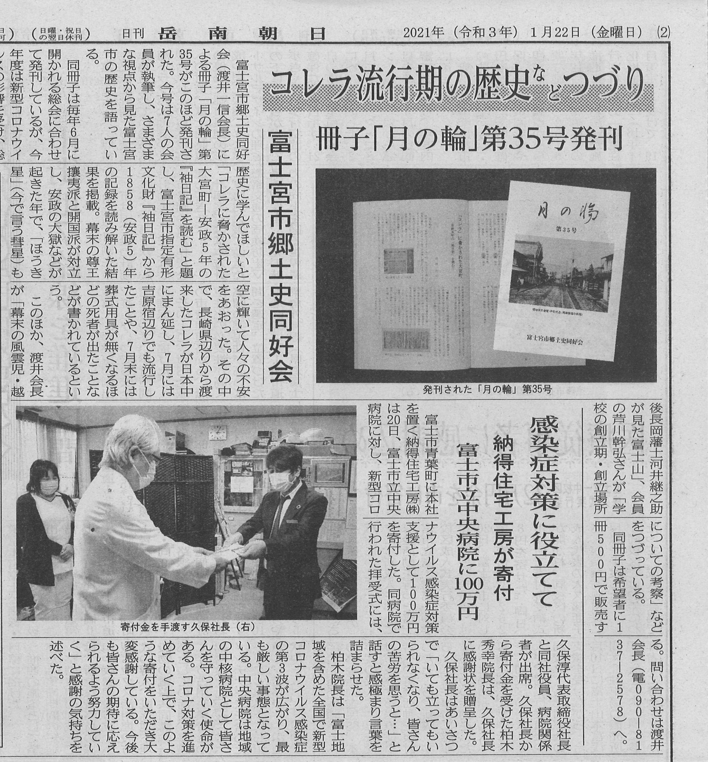 この度、納得住宅工房グループでは、逼迫した医療現場において市民のためにご尽力くださっている富士市立中央病院様に感謝の意を表し寄附金100万円の贈呈及び、当社社員一同より募った支援金にて約500名の医療従事者のみなさまに心ばかり差し入れをお届けさせていただきました。
