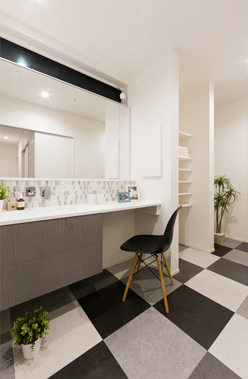 カウンターとシンクが一体になった“RUSSHELO(ルシェーロ)”、キッチンと同じ面材を使用するので、色の組み合わせを楽しめる“ALEX(アレックス)”だけでなく、照明のラインを仕込んだ鏡“ALINA(アリーナ)”もお勧めです。